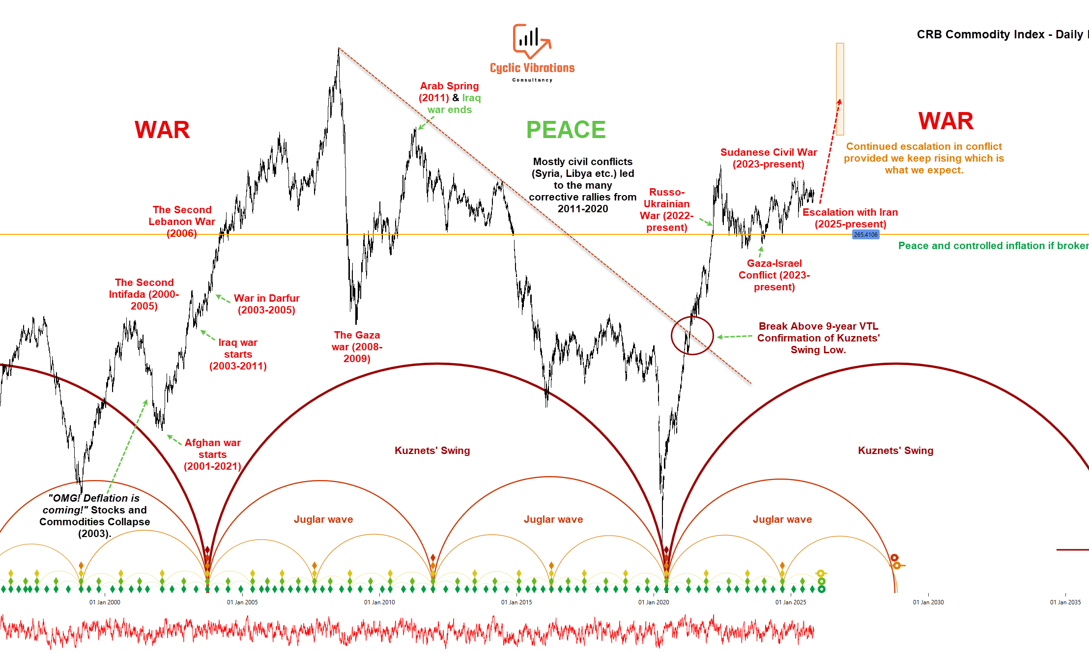 The analysis connects the Kuznets and Kondratieff cycles to commodity price trends, predicting a significant price rise in 2026, indicating potential global conflict. The 18-year pattern anticipates a 26-month upswing, but a market peak is likely in 2027, with geopolitical tensions easing and price troughs expected in early 2029.