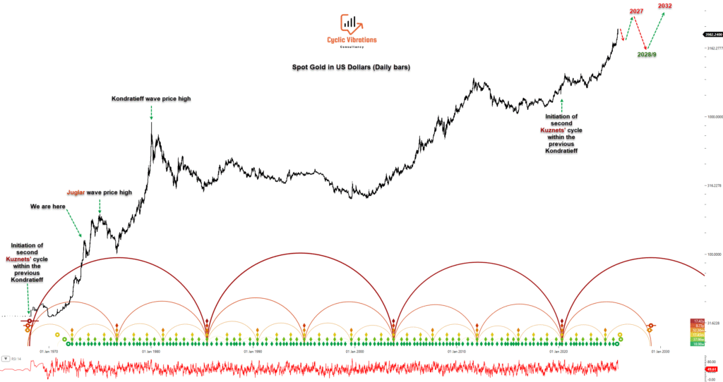 With five years having elapsed since the current Kuznets’ Swing began in 2020, our current phase is cyclically analogous to 1973 (1968 + 5 years). This suggests that after a probable, near-term corrective leg lower (the subject of forthcoming analysis), precious metals are poised to resume their ascent, targeting new highs into the anticipated Juglar wave peak in 2027.