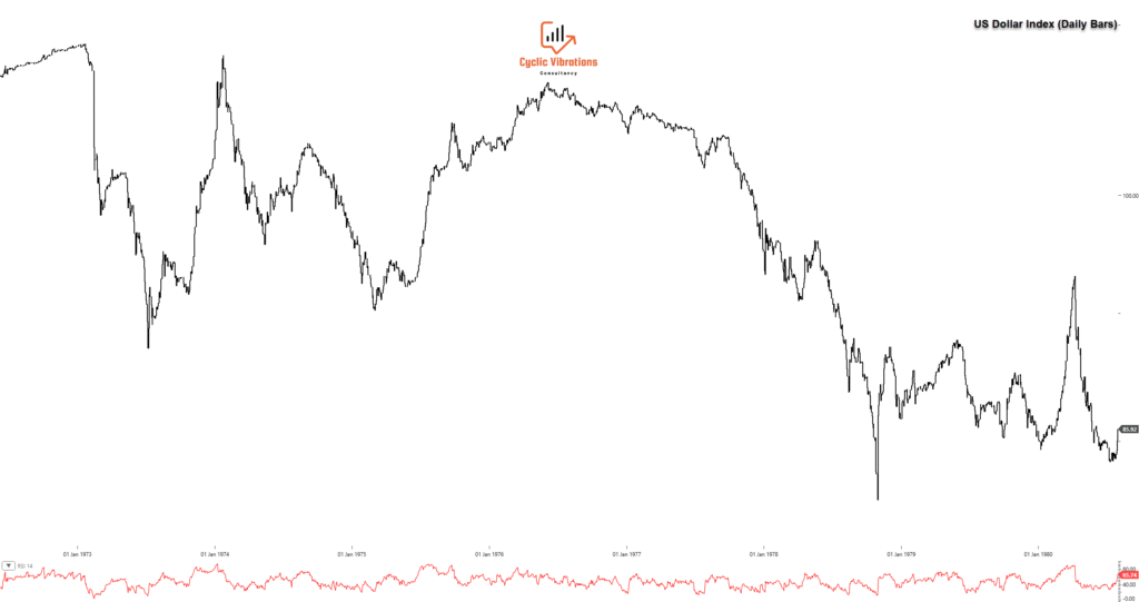 Given the global and interwoven nature of these economic cycles, this analysis implies a similar phase for the US Dollar Index (USDX). We anticipate USD action structurally mirroring the period from 1973 to 1980. This historical analogue provides a sobering expectation for the USD’s performance, reinforcing the central thesis of sustained Dollar decline until the final cycle peak around 2032. The convergence of the Kuznets’ and Kondratieff frameworks thus provides a highly detailed, decade-long roadmap for the inverse performance of precious metals and the global reserve currency.