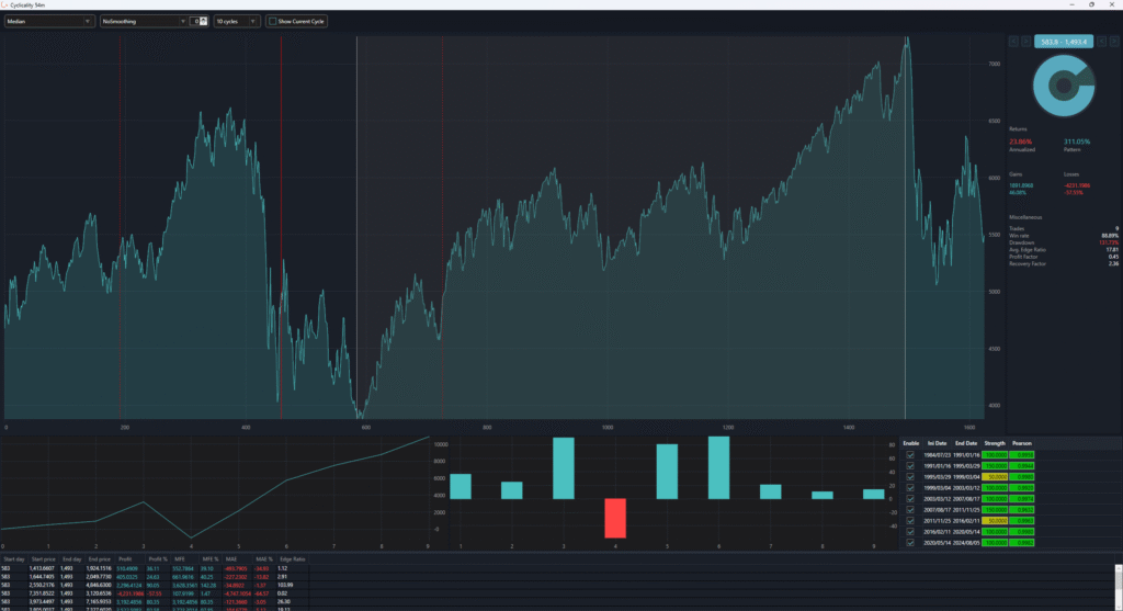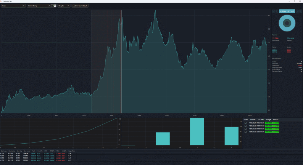 With TimeSeriesSCC, you can quickly conduct comprehensive statistical tests for trading strategies based on any identified Hurst cycle. As always, the system instantly processes the data and provides you with all the necessary statistics—including Win Rate, Profit Factor, and Recovery Factor—to confidently aid your final decision-making process. Leverage data, not guesswork, to exploit cyclical patterns at any timeframe.