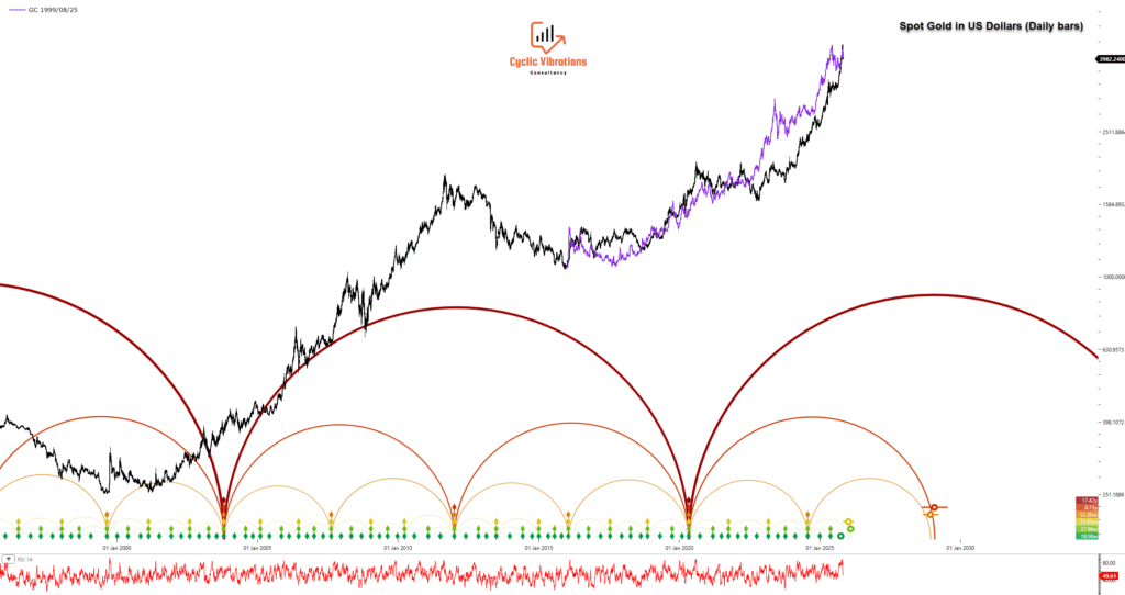 Instead, the position determined by the long-term cycle provides a high-confidence directional bias that guides trades on shorter, more volatile waves. For instance, we successfully leveraged the overarching influence of the 54-year cycle position to inform precise trading decisions based on minor cycle fluctuations within the projection, specifically the 20-day and 40-day price waves.